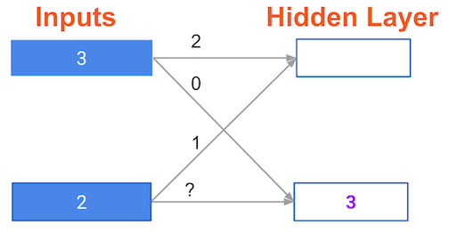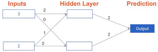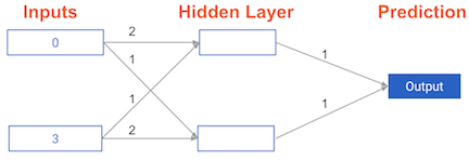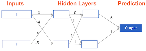 You now have a model with 2 hidden layers. The values for an input data point are shown inside the input nodes. The weights are shown on the edges/lines. What prediction would this model make on this data point?